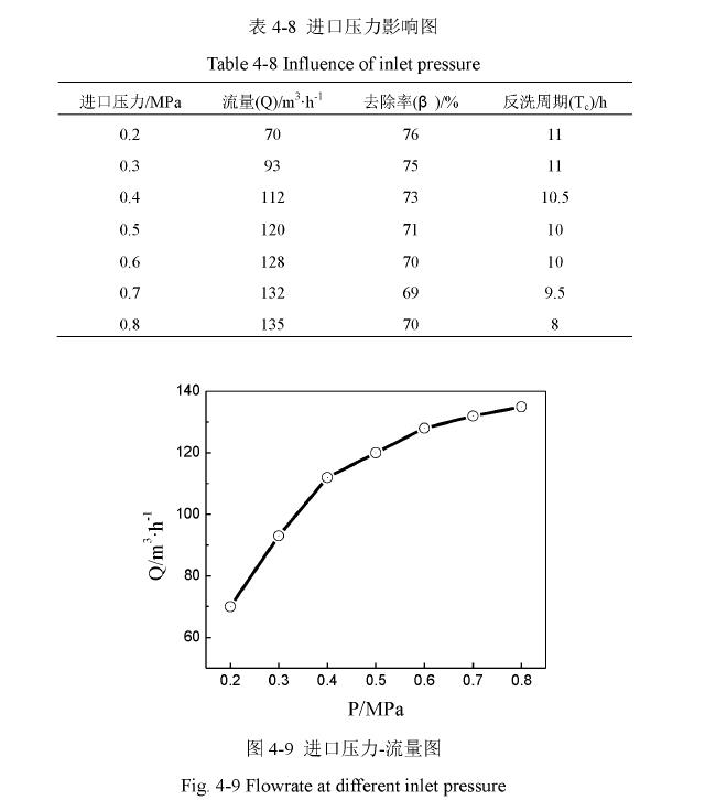 在整個(gè)試驗(yàn)中,首先要考慮的是這種陶瓷膜對磷酸銨鎂的過濾效果。由于廢水中所含的雜質(zhì)十分復(fù)雜,不有磷酸銨鎂沉淀,還有泥沙和一些膠狀物質(zhì),陶瓷膜截留的物質(zhì)很難單獨(dú)測定出某種物質(zhì)的含量,所以直接測量過磷酸銨鎂的率很難做到。為了能直觀而簡便的測出處理的效果,取進(jìn)出口廢水各,抽濾,然后在℃烘干,對比進(jìn)出口的質(zhì)量,以此來反映磷酸銨鎂沉淀的效果。進(jìn)口壓力關(guān)系到出水流量能否達(dá)到設(shè)計(jì)的要求,還關(guān)系到系統(tǒng)的穩(wěn)定性和反洗的周期長短。